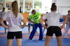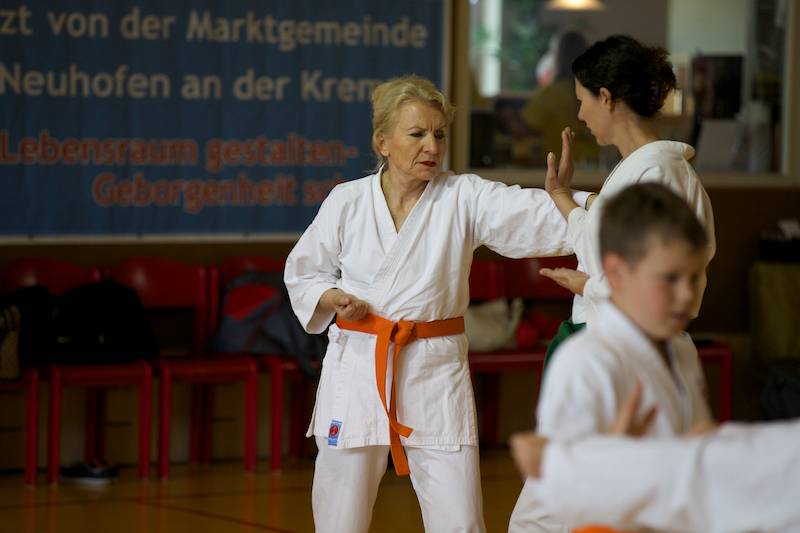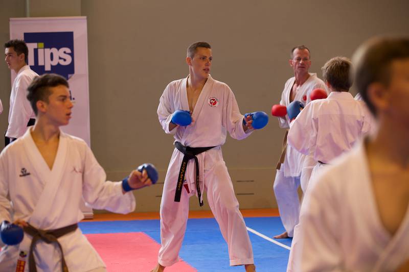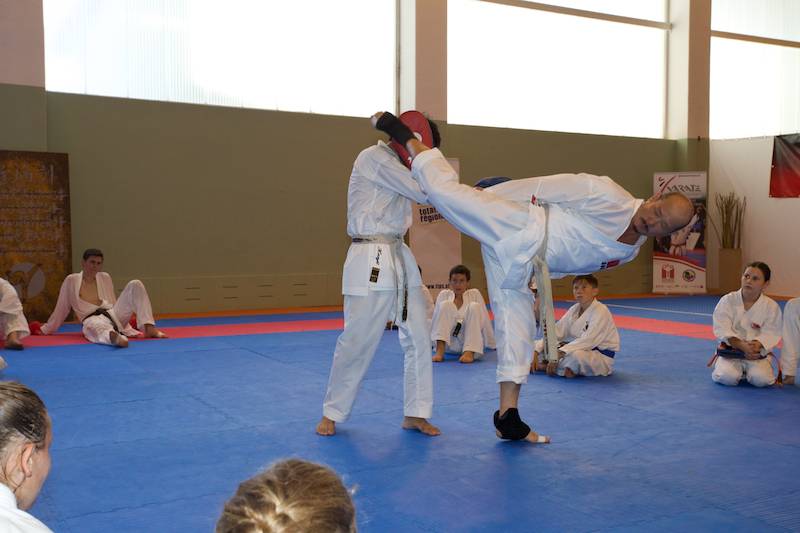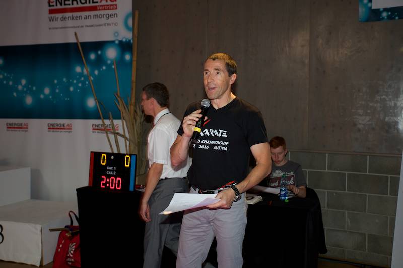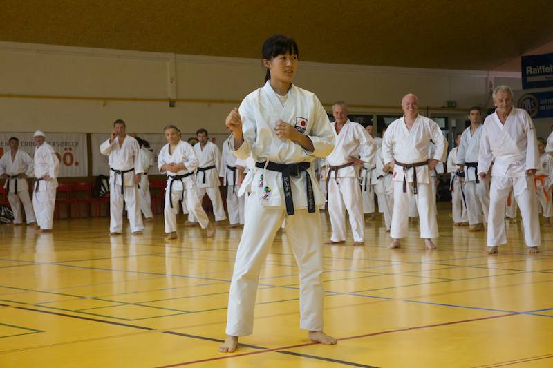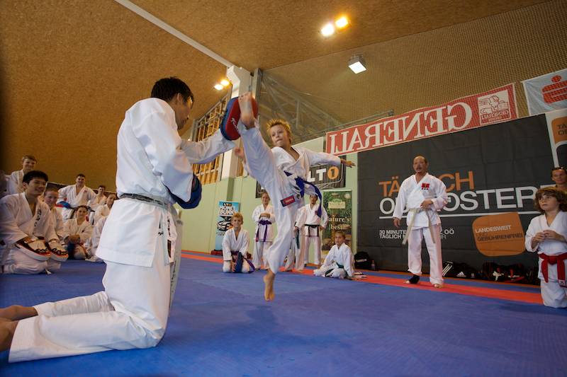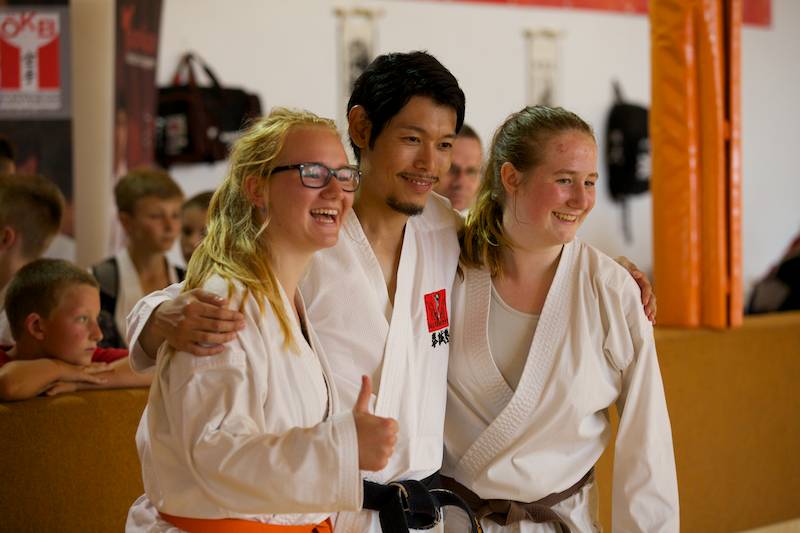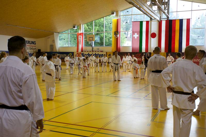 Ab Donnerstag ging`s dann wieder voll zur Sache und schon bei der offiziellen Eröffnung unter Anwesenheit vieler wichtiger Gäste gab es eine große Überraschung, die viele sehr erfreute. Dem Veranstalter und Leiter vom Verein Sei Bu Kan Neuhofen Christian Ramsebner wurden wegen besonderer Verdienste für den Karatesport vom ÖKB Präsidenten Konsulent Ing. Karl Hillinger der 2. DAN verliehen. Nach einigen einleitenden Worten startete dann das ersehnte Welcome-Training. Danach konnte man wieder zwischen jeweils zwei verschieden Kumite- bzw. Kata- Trainings, abgestimmt auf die jeweilige Graduierung, parallel in vier Hallen wählen. So nutzten knappe 400 SportlerInnen die einmalige Gelegenheit mit weltbesten Trainern des Karatesports zu trainieren: Samad Azadi, (Deutschland), Seiji Nishimura und Kenji Hashimoto (Japan), Silvio Campari (Italien), Ayoub Neghliz (Frankreich), Mag. Ewald Roth, Dragan Leiler und Daniel Devigili (Österreich) gaben wieder ihr Bestes um den lernhungrigen Karatekas Neues beizubringen bzw. Altes zu verfeinern.